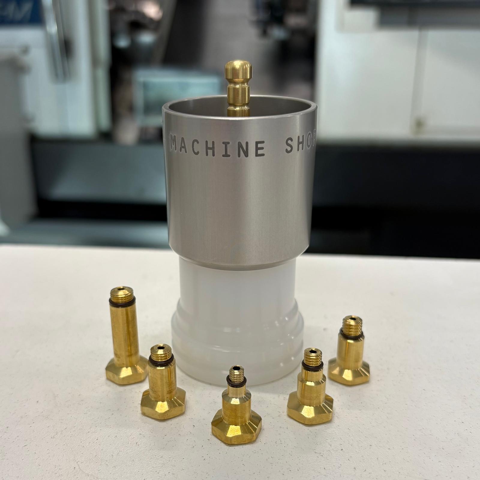 CNC machined from a solid bar of 6061 grade aluminum, the cup sits rigidly in place and seals perfectly, with no wobbly plastic threads to worry about stripping. Supplied with an equally elegant plug, machined from solid brass.